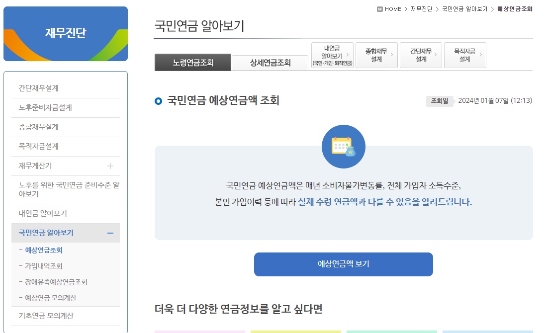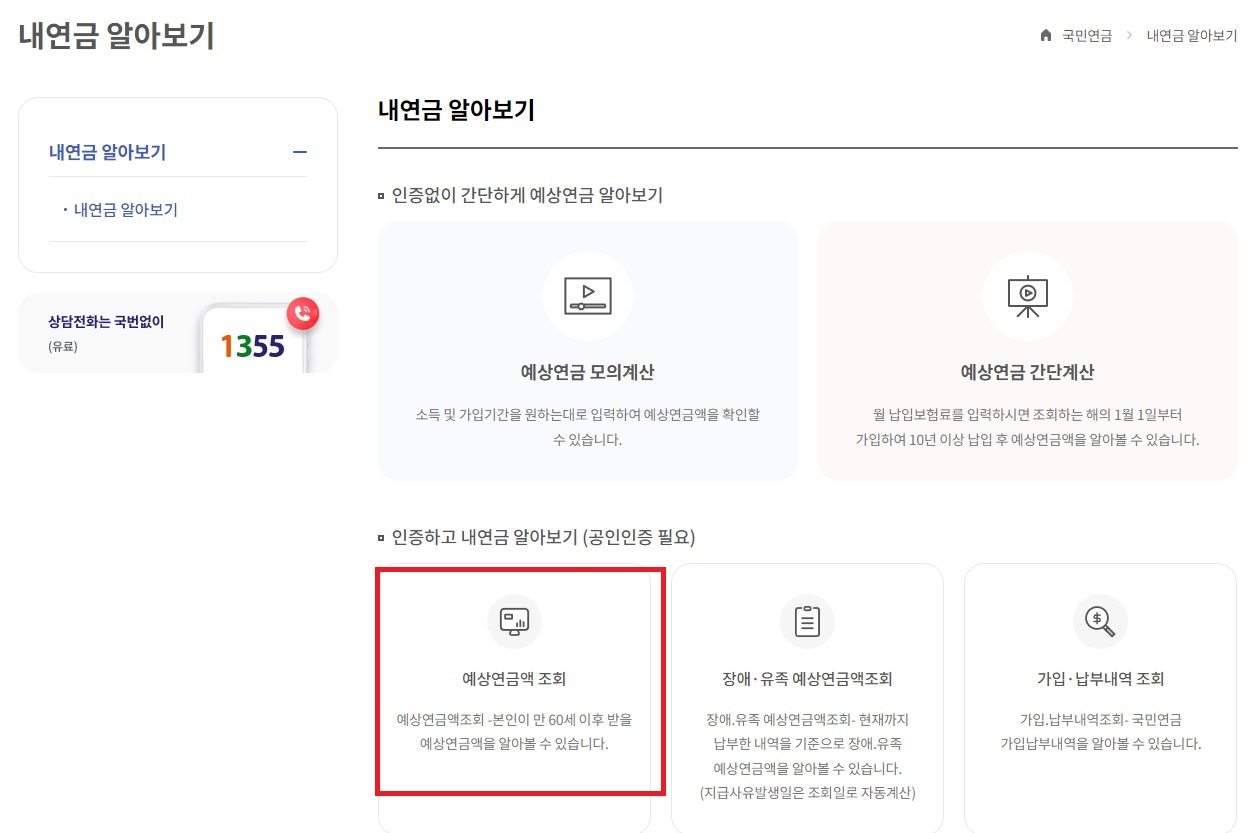 '내 연금 알아보기' → '예상연금액 조회'가 가능합니다.