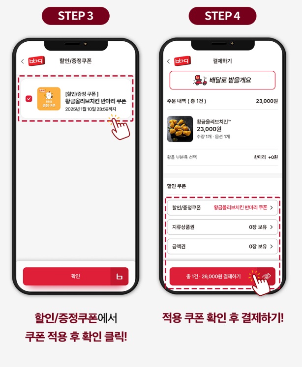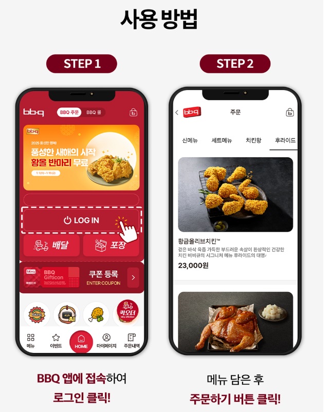 1. BBQ 앱이나 홈페이지에 접속해 치킨 한 마리 이상을 주문하세요.